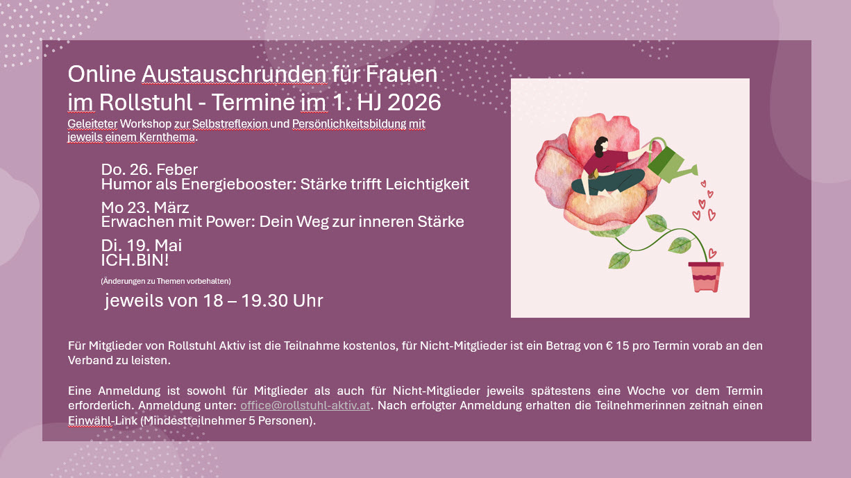 Eine Anmeldung ist sowohl für Mitglieder als auch für Nicht-Mitglieder jeweils spätestens eine Woche vor dem Termin erforderlich. Anmeldung unter: office@rollstuhl-aktiv.at. Nach erfolgter Anmeldung erhalten die Teilnehmerinnen zeitnah einen Einwähl-Link (Mindestteilnehmer 5 Personen).