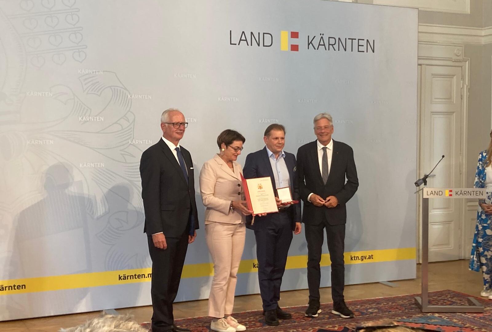 Die Auszeichnung wurde von Landeshauptmann Peter Kaiser, Landesrätin Beate Prettner, dem Präsidenten des Kärntner Landtags, Reinhart Rohr, und dem stv. Landesamtsdirektor Markus Matschek, überreicht.
